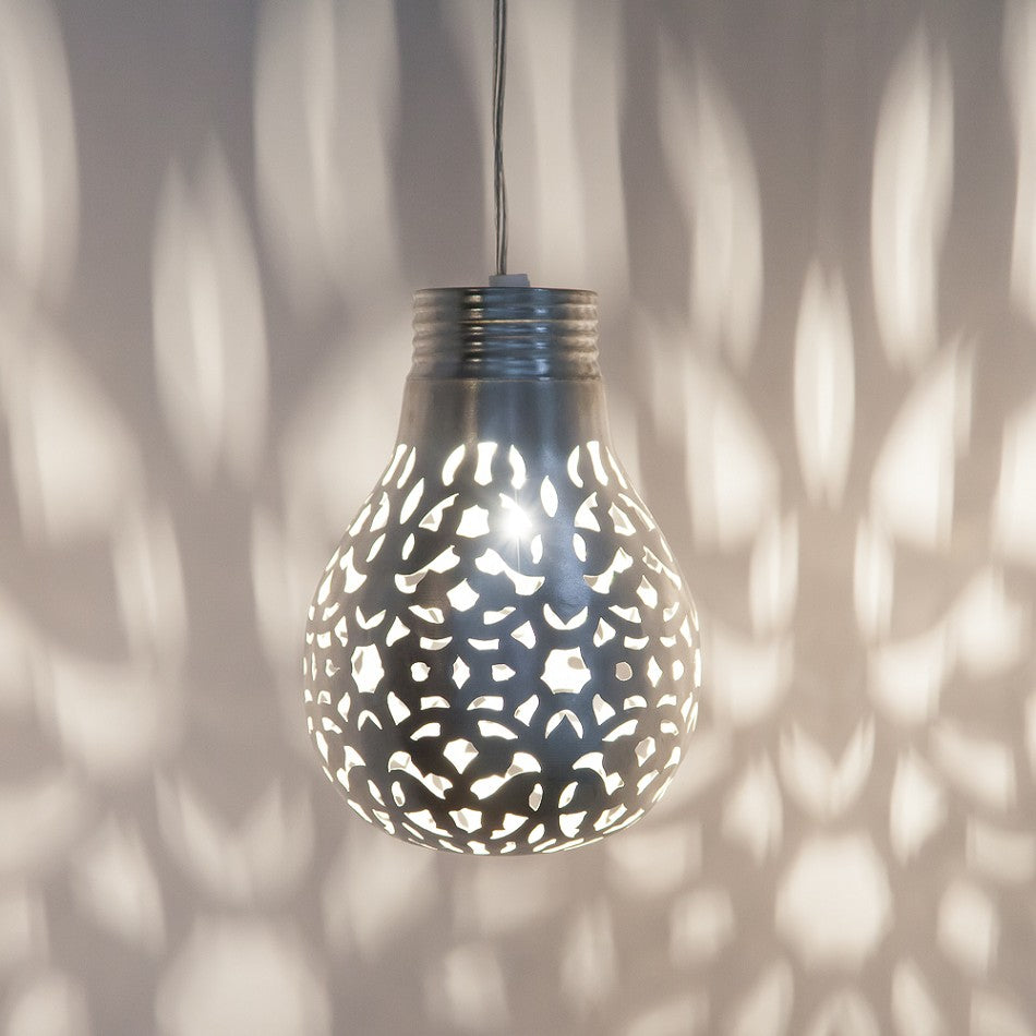 Handmade silver plated brass lamp with hole pattern which creates a shadow pattern on the wall when using a transparant light bulb.