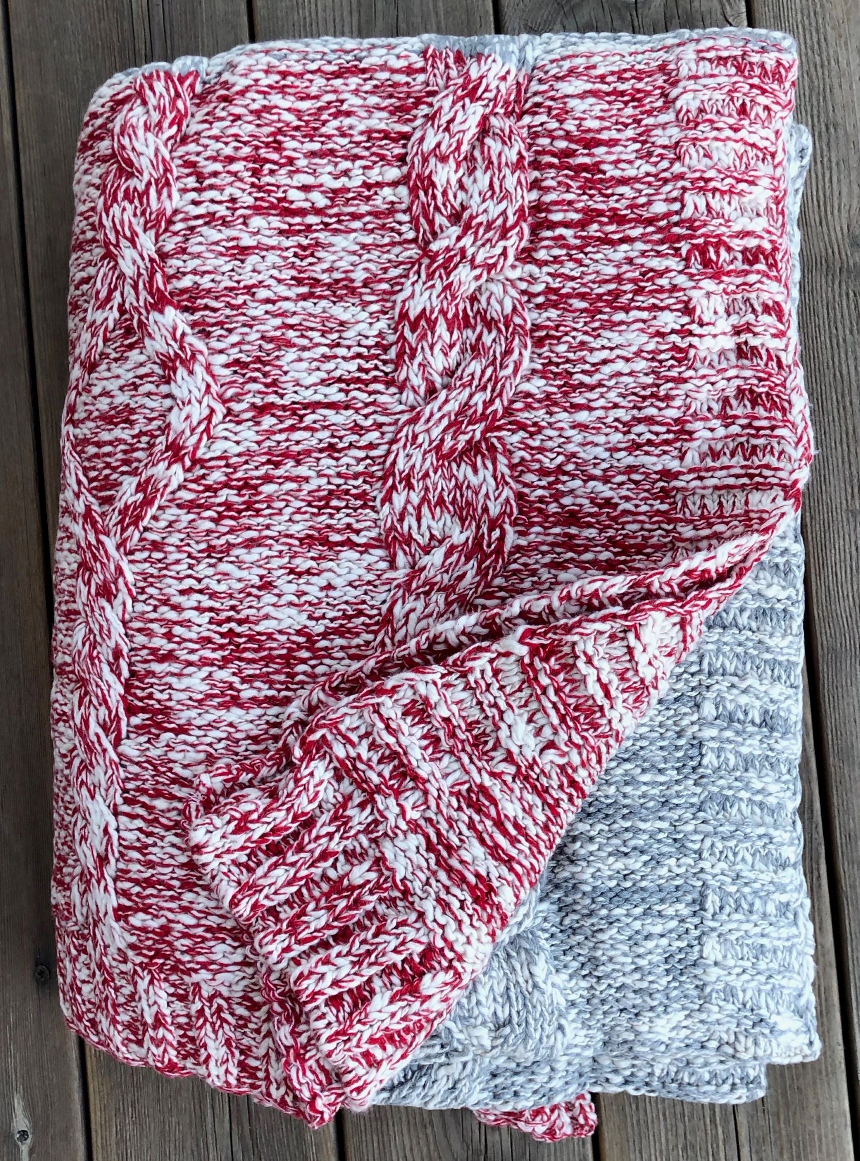 Deilig pledd i bomull. Gråmelert flettestrikk med rød strip nederst.