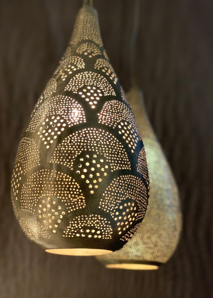 Handmade silver plated brass lamp with hole pattern which creates a shadow pattern on the wall when using a transparant light bulb.