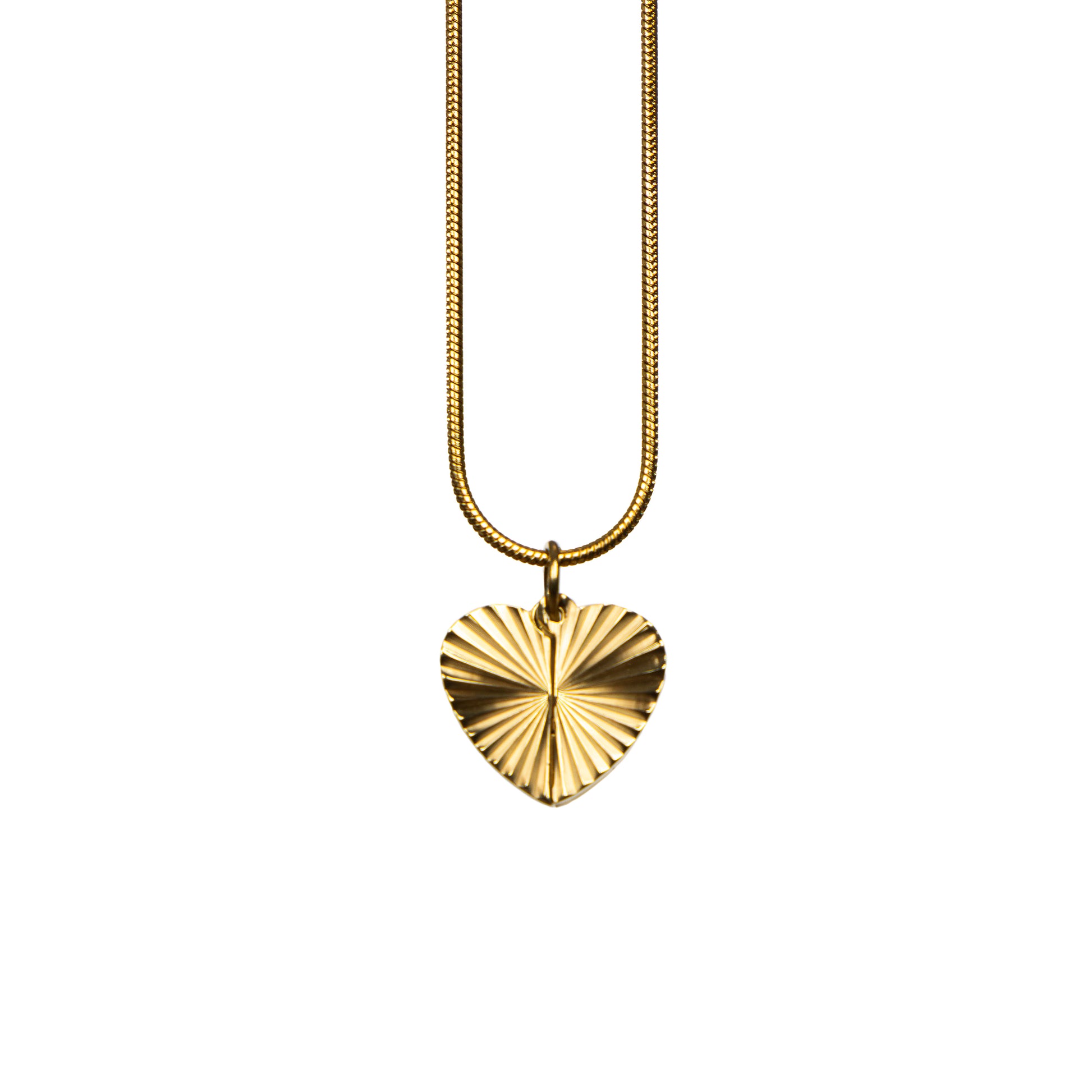 Smykket er laget av rustfritt stål, forgylt med 14 karat gull. Overflaten på det ytterste hjertet har et eksklusivt rillemønster. Halskjedet er selvfølgelig bly- og nikkelfritt.