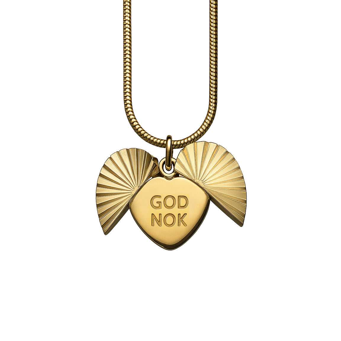 Dette betydningsfulle halskjedet har teksten “STERK SOM FAEN” som et kraftfullt mantra, en påminnelse om egenverdi og styrke. Hjerteåpner smykket er et smykke som rommer mer enn et lekkert hjerte – det rommer en tekst fylt med kjærlighet. På dette smykket står det STERK SOM FAEN på hjertet som kommer frem når man åpner det. Da vil også det åpnede hjerte ligne et sett med englevinger.