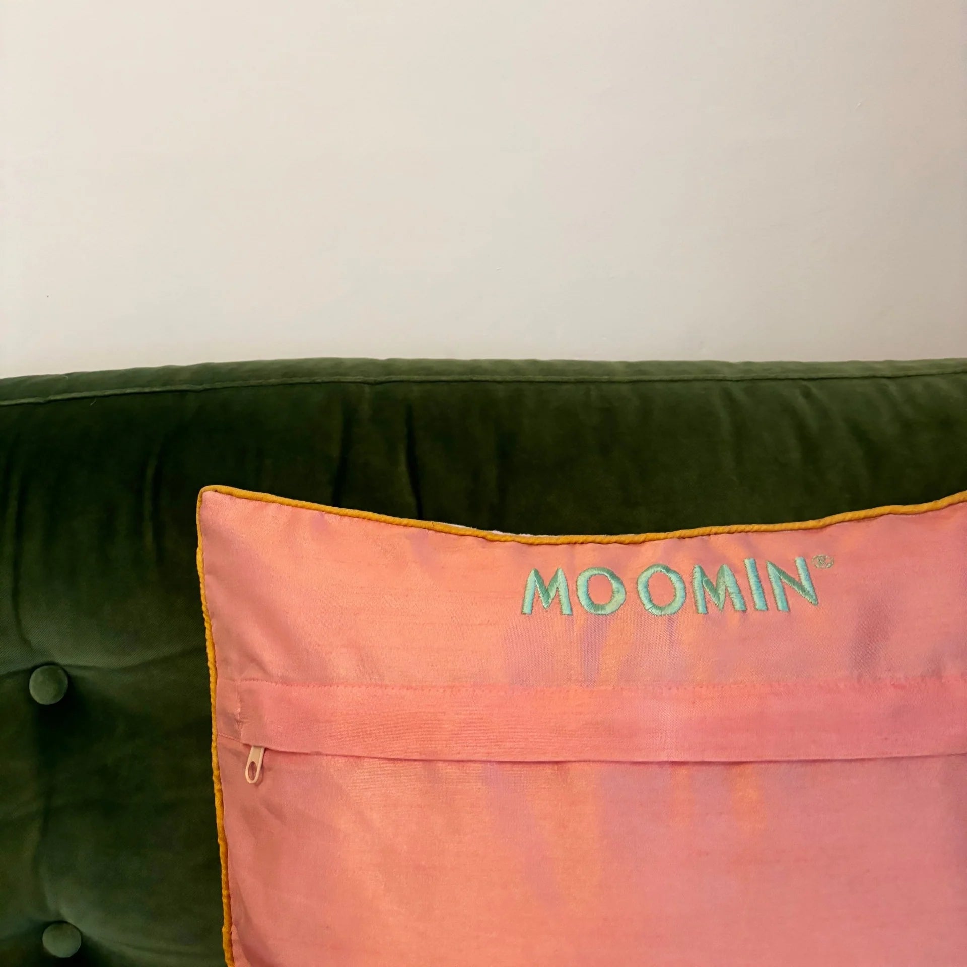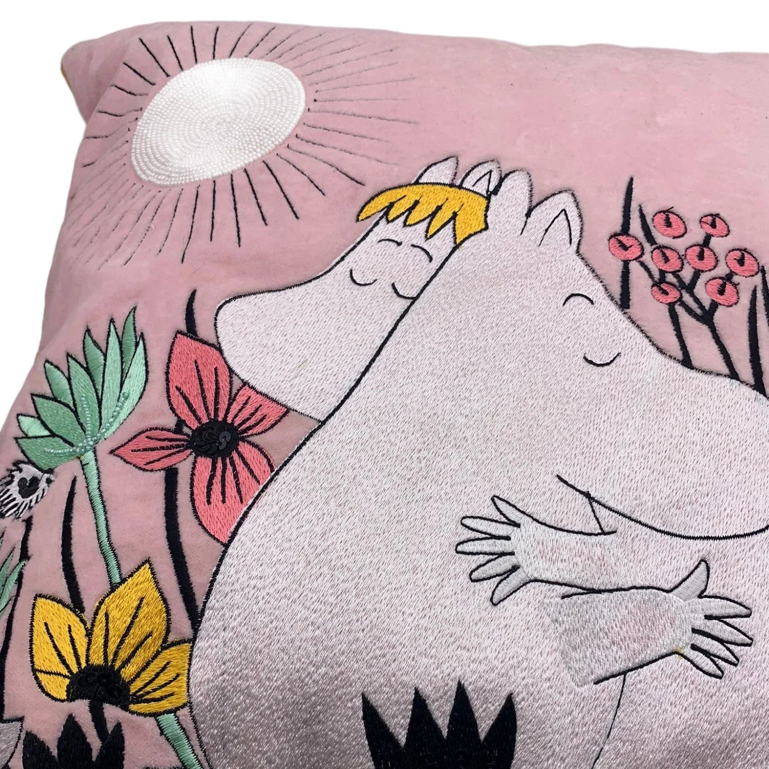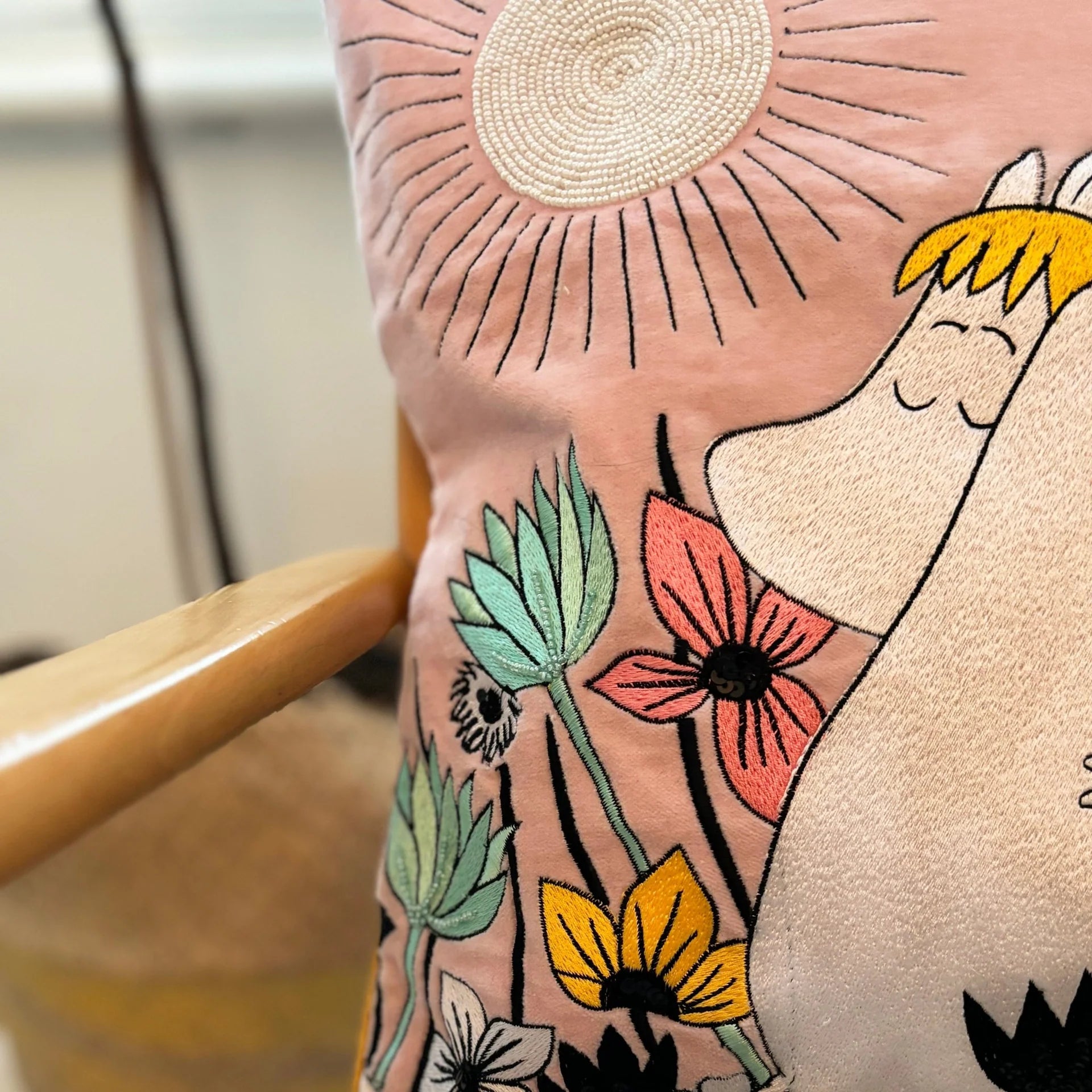 Legg til et snev av Mummidalen i hjemmet ditt med denne nydelige broderte Mummi-puten i dus rosa fløyel. Motivet viser Mummitrollet og Snorkfrøken i et kjærlig øyeblikk, omgitt av høye blomster og frodig natur – en romantisk og stemningsfull detalj til interiøret.