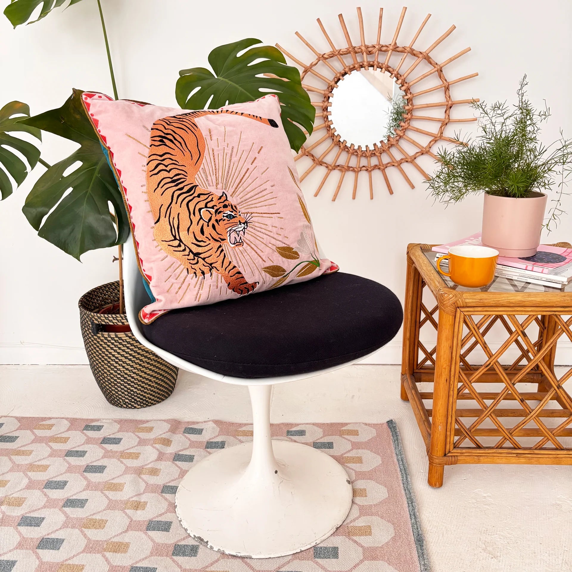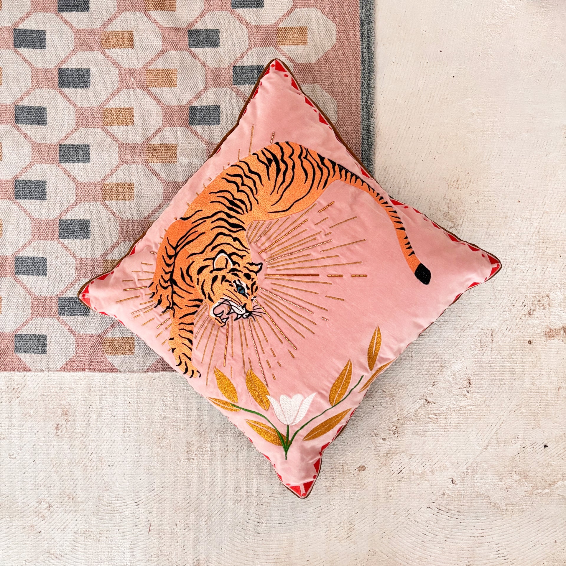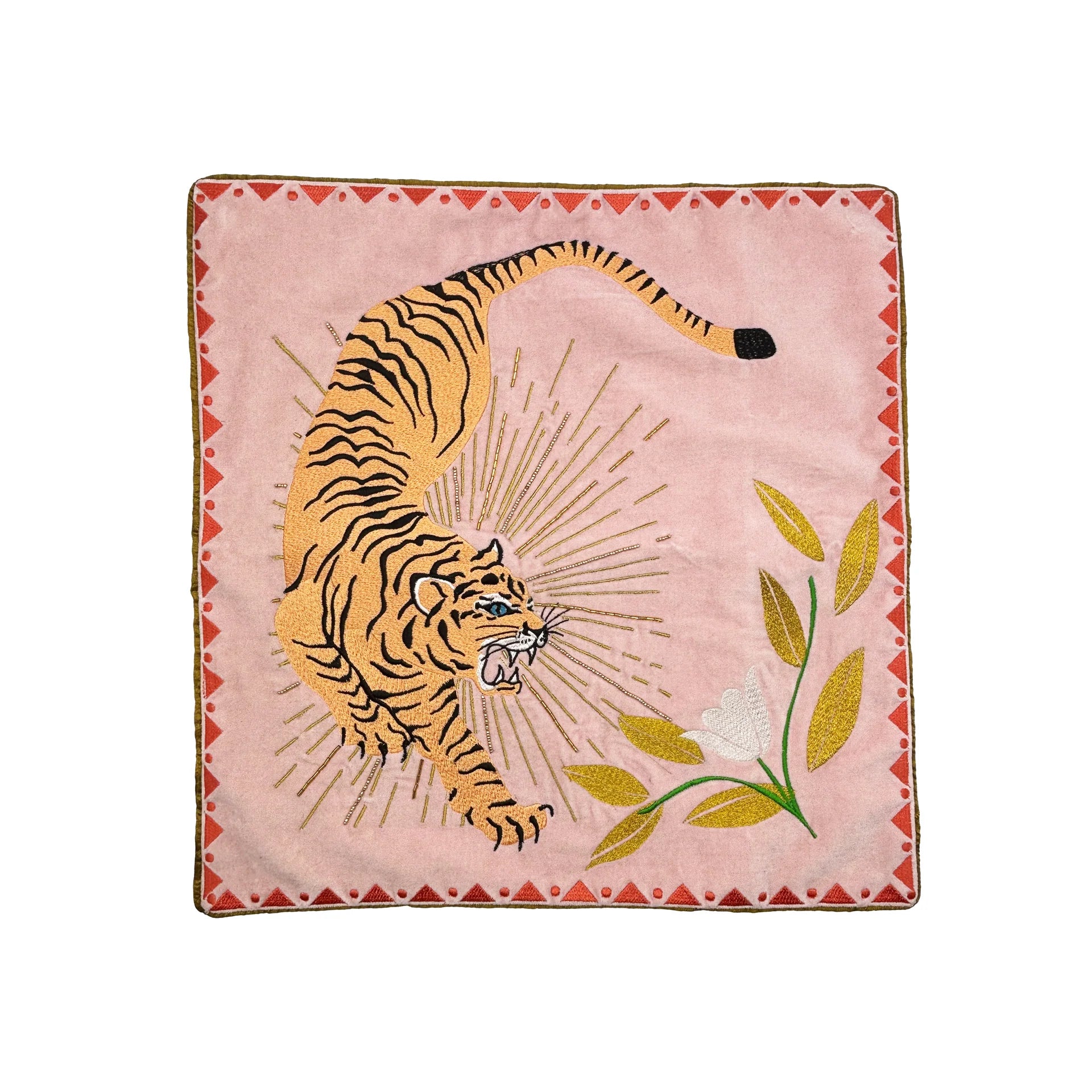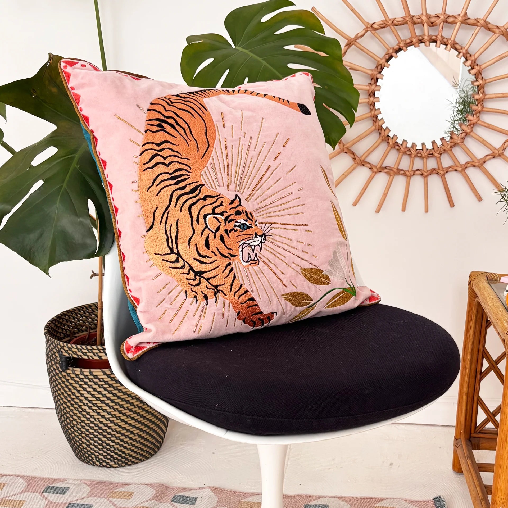Gi interiøret et luksuriøst løft med denne nydelige broderte fløyelsputen i pudderrosa. Motivet er inspirert av tradisjonell tatoveringskunst, og viser en majestetisk tiger omgitt av en gyllen solstråle og florale detaljer – et unikt blikkfang som tilfører både attitude og eleganse.