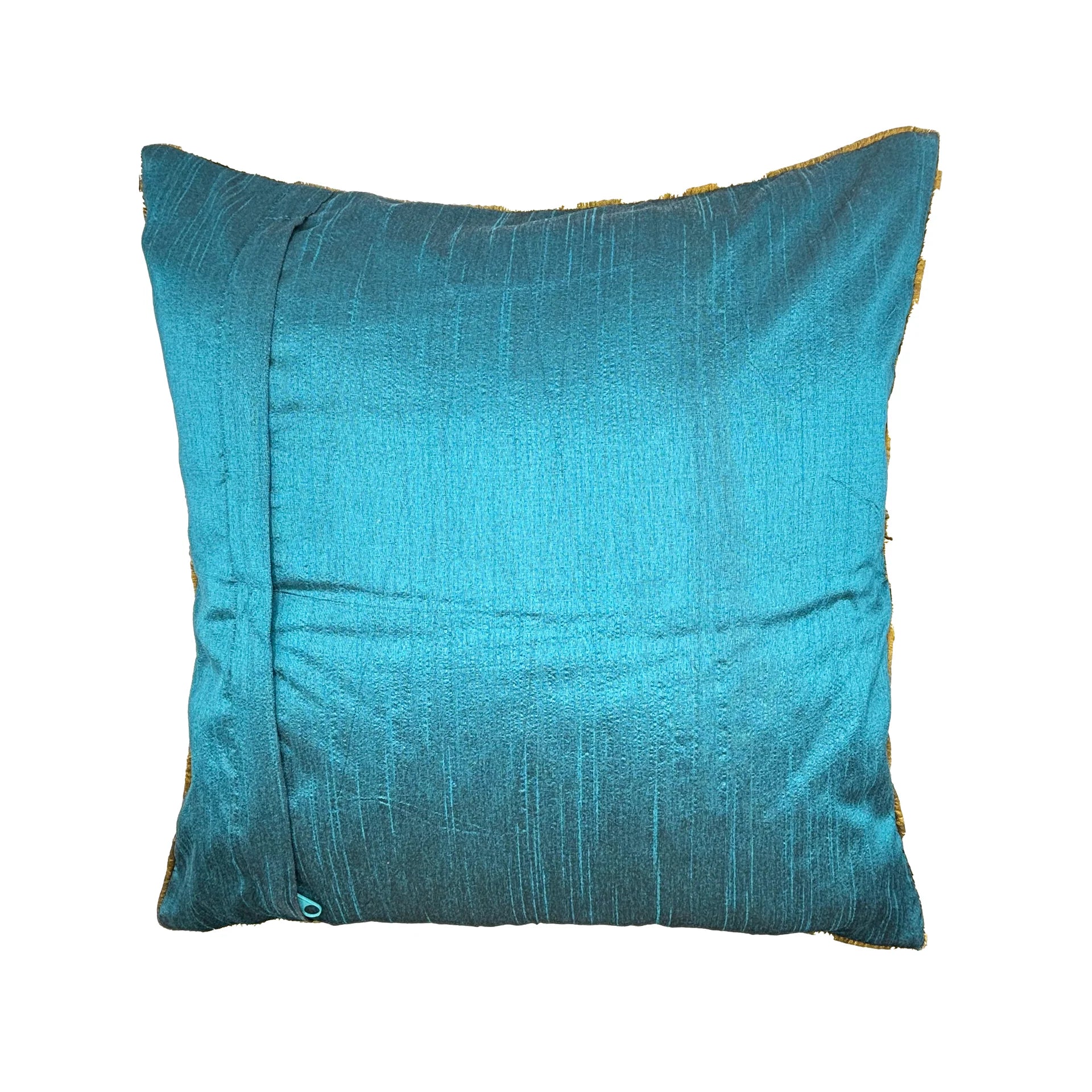 Puten kombinerer klassisk håndverk og moderne design, med gulltråd, glassperler og kontrastbrodert kant som gir et eksklusivt uttrykk. Den har myk gullfarget piping og en tealfarget bakside i polydupion-stoff for en sofistikert finish.