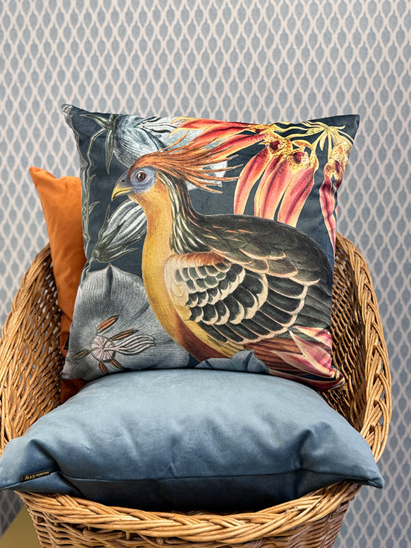 Gi interiøret et nytt uttrykk med denne vakre fløyelsputen fra VanillaFly. Puten har et detaljert motiv av en stor fugl omgitt av florale elementer, og kombinerer klassisk eleganse med et kunstnerisk preg.