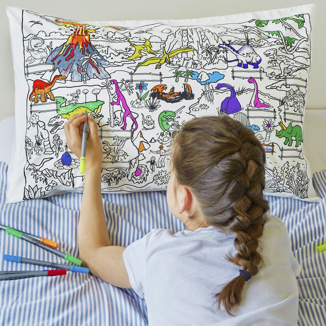 This cool dinosaur colour-in pillowcase makes one of the best gifts for children who like dinosaurs! They can colour-in and write on the different dinosaur names using the enclosed set of ten wash-out fabric pens. Then simply wash the pillowcase on a warm cycle, the ink disappears completely, and it's ready to go again! It's a fantastically fun and educational gift for kids and they can find out more info about the dinosaurs they're colouring on our learning resource page here!