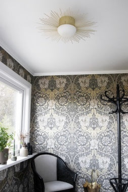 "Soleil" eller sol på svenska, är inspirerad av solspeglar och Louis XIV. Denna trendiga lampa i Borstad Mässing/Metall samt Vitt glas går utmärkt att använda antingen som vägglampa med medföljande Transparenta sladd (200 cm), eller som plafond i taket.
