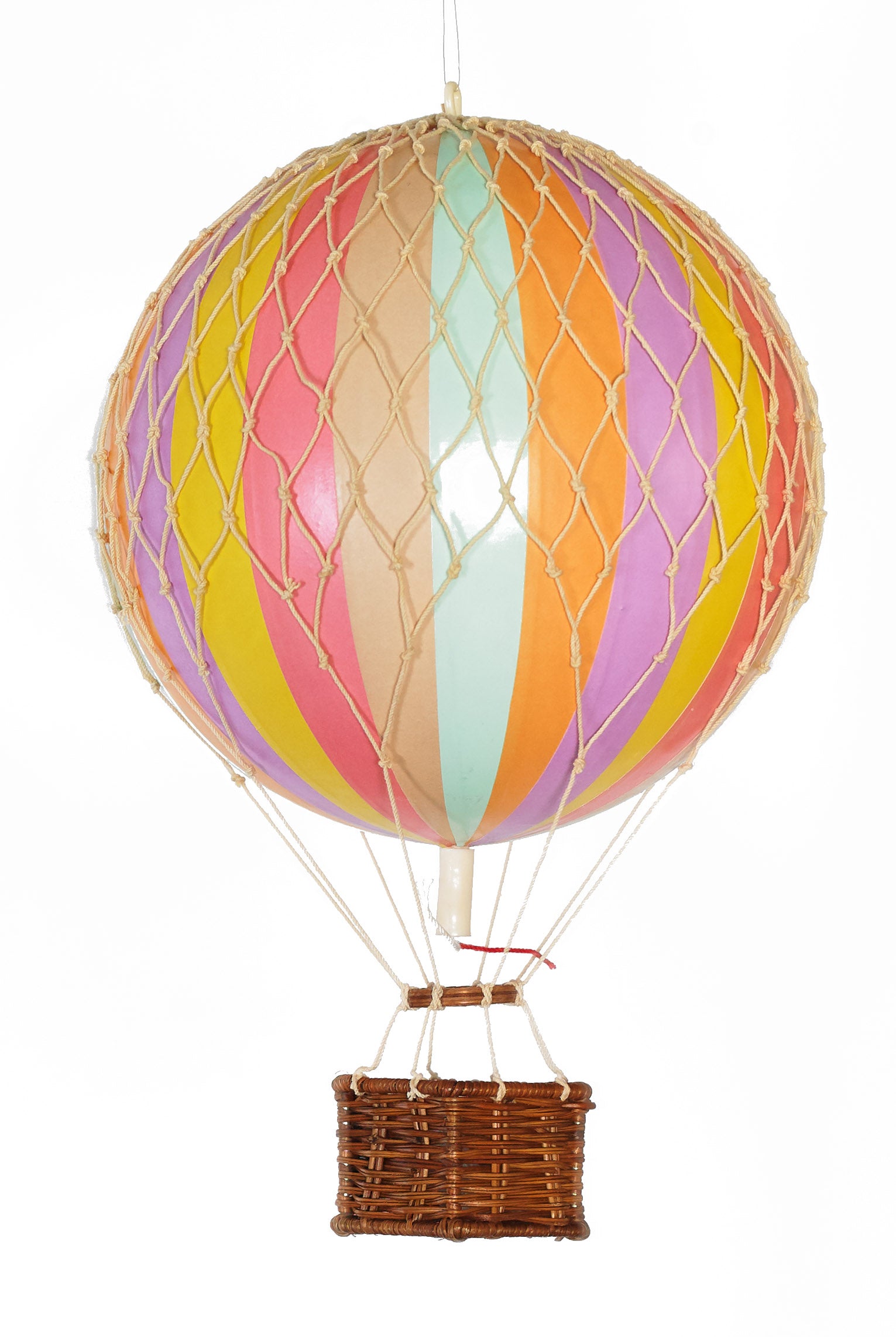 Helium balloons were one of aviation's first successes. Since 1783, balloons have traveled the skies, often in unintended directions. Hand applied balloon strips. Hand woven netting and basket. Wooden toggles and sand bags.